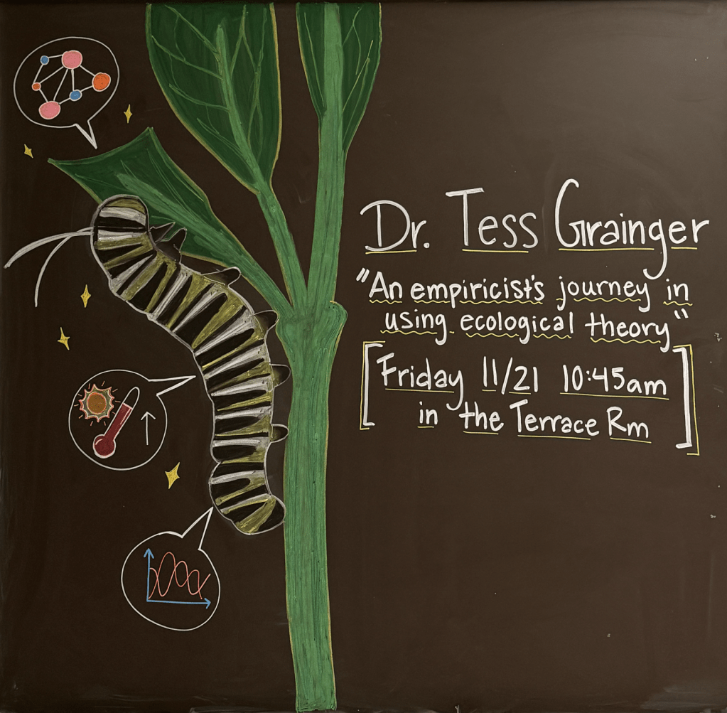 November 2025: Tess had a great visit to Michigan State University and Kellogg Biological Station! Beautiful chalkboard art by Morgan Clark 👌